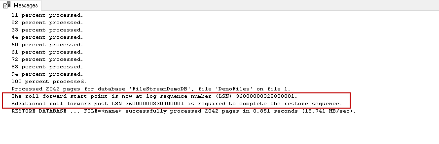 Processed 2041 pages for database ‘FileStreamDemoDB_Restore’, file ‘DemoFiles’ on file 9.