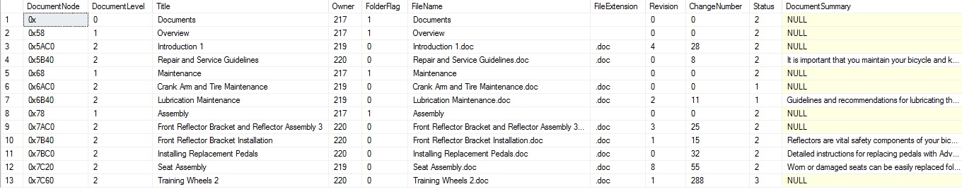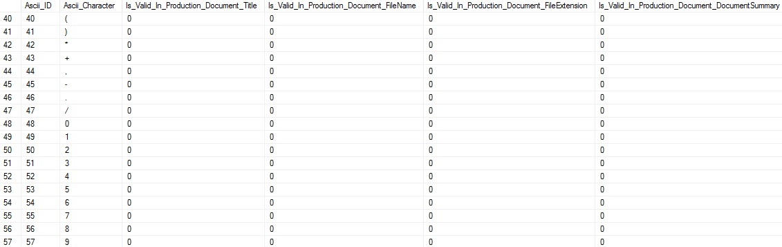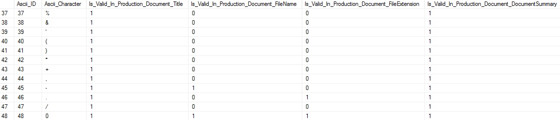 We can see that, depending on the rules for each column, different ASCII characters are allowed (or not allowed). This table can be updated whenever business needs change, new use-cases arise, or wish to customize any existing data further. Now that this table is complete, we can move on to using this metadata in order to effectively populate the Production.Document table.
