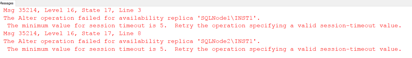 We should set an appropriate session timeout in the availability group depending upon our infrastructure requirements. The session timeout value should set session timeout greater than or equal to 10 seconds. It is not recommended to use session timeouts below 10 seconds because we might have the possibility of missing ping response in a busy system, and it could cause a false alarm.