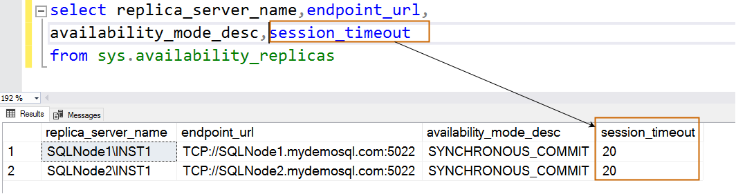 Alternatively, you use the ALTER AVAILABILITY GROUP statement to modify the session_timeout values. The below scripts modifies the session timeout value to 20 seconds.