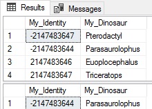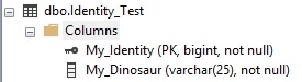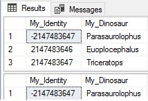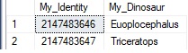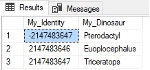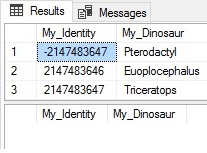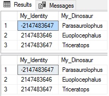 INSERT INTO dbo.Identity_Test (My_Dinosaur) VALUES ('Troodon'); SELECT * FROM dbo.Identity_Test; SELECT * FROM dbo.Identity_Test_BIGINT; |
