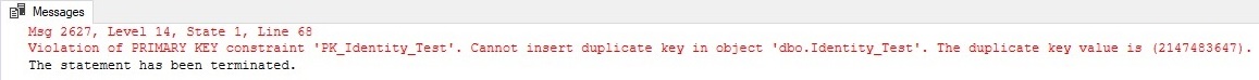 DBCC CHECKIDENT ('Dbo.Identity_Test', RESEED, 2147483646); |