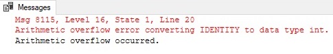 When a SQL identity column reaches its limit, all insert operations will fail. We can test this easily by creating a table with an identity column, reseeding it to its limit, and then trying to insert a new row. Here’s a table with only 2 columns, an identity that is set to a seed near its maximum value and a string: