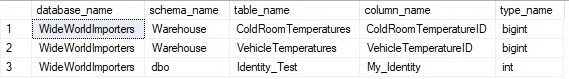 This database contains three SQL identity columns, including the one we created earlier in this article. Our system views return the schema, table, and column name, as well as the data type. Filtering on columns.is_identity = 1, we can limit our result set from all columns to only those that are defined with the IDENTITY attribute.
