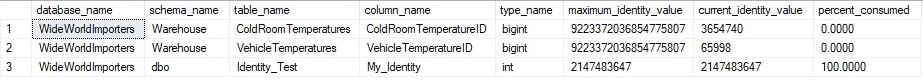 These results provide us with everything we need to understand how much of an identity columns data space has been consumed. We can see that the first two columns are safe for now, as they have an immense amount of identity values to churn through before being in danger of running out. Our test table, on the other hand, is at 100% capacity. As we recall from the demo earlier, this column has no space left and INSERT operations against it will fail due to this limit.