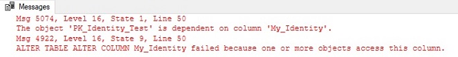 ALTER TABLE dbo.Identity_Test DROP CONSTRAINT PK_Identity_Test; ALTER TABLE dbo.Identity_Test ALTER COLUMN My_Identity BIGINT NOT NULL; |