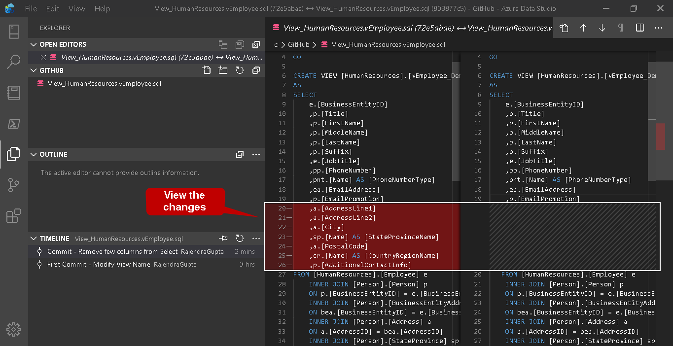 Click on the Commit- Remove few columns from select, and you can see the changes we did in the SQL script for this commit: