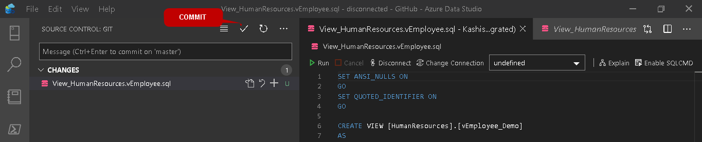 In this section, we will modify an existing SQL script in the Git source control. Click on the script in the GitHub folder, and it opens the script in the new query window.