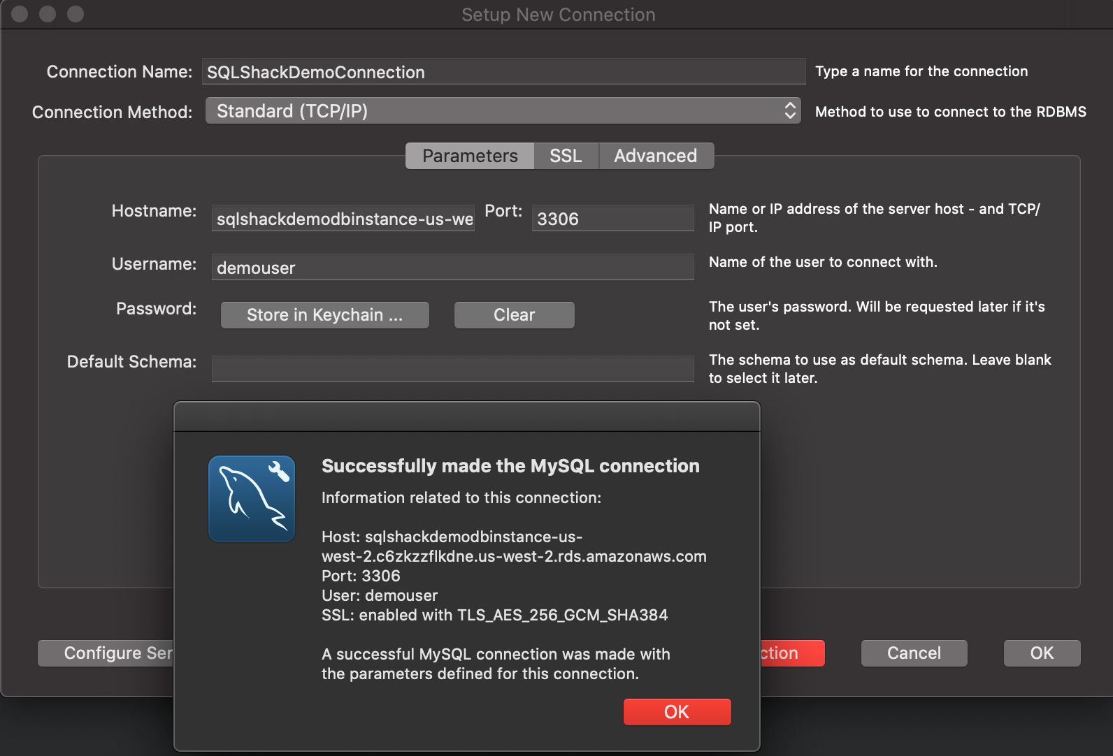 Let us now head over to MySQL Workbench and try connecting to the hostname with the credentials that we have provided earlier. Use the hostname, username and password to connect to the instance.