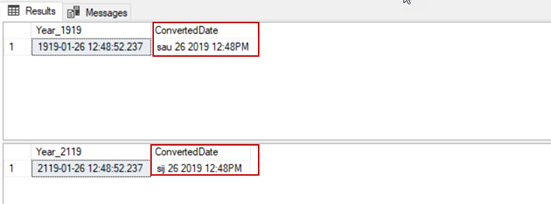 Another consideration is about year format. In some circumstances, we can use style parameter which does not return century format but this case may cause some confusing situations. Such as in the following sample we have two different dates and also these dates store different years however the output of the SQL CONVERT function are similar.