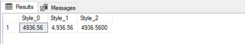 DECLARE @Money AS MONEY=$4936.56 SELECT CONVERT(Varchar,@money,0) AS [Style_0] , CONVERT(Varchar,@money,1) AS [Style_1] , CONVERT(Varchar,@money,2) AS [Style_2] |