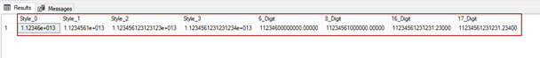 DECLARE @VarFl float=11234561231231.234 SELECT CONVERT(varchar(100),@VarFl,0) AS [Style_0], CONVERT(varchar(100),@VarFl,1) AS [Style_1], CONVERT(varchar(100),@VarFl,2) AS [Style_2], CONVERT(varchar(100),@VarFl,3) AS [Style_3], STR(CONVERT(varchar(100),@VarFl,0),20,16) as [6_Digit], STR(CONVERT(varchar(100),@VarFl,1),20,16) as [8_Digit], STR(CONVERT(varchar(100),@VarFl,2),20,16) as [16_Digit], STR(CONVERT(varchar(100),@VarFl,3),20,16) as [17_Digit] |