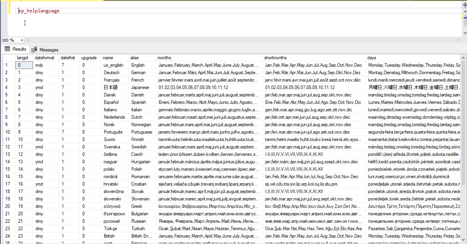 Date/Time formats can vary according to locale settings and for this reason we require various formats to represent date/time. Imagine that you have an application and different countries users use this application, so if someone connects this application in U.S, you have to represent the date as month/day/year format. On the other side, another user connects this application in U.K. and you have to represent date format as day/month/year format. In this case we have to determine the date/time representing style according to locale date/time setting. sp_helplanguage stored procedure returns supported languages with detailed information’s in SQL Server.