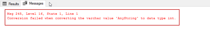The SQL TRY_CONVERT function is an advanced form of the SQL CONVERT function. The main advantage of the SQL TRY_CONVERT function is protecting from data converting errors during query execution. It is possible that we can experience errors on data convert process with the SQL COVERT operation due to non-suitable or dirty data. However, the SQL TRY_CONVERT function allows us to avoid these types of errors. At the same time, there are no syntax differences between the SQL CONVERT and TRY_CONVERT functions. The SQL TRY_CONVERT function returns NULL value if the data conversion generate an error. In the below example, at first we will try to convert character value to an integer through the SQL CONVERT function and this operation will return an error.