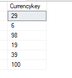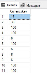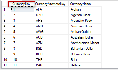 Notice that this table has the CurrencyKey column, we will use this column to get common values between this table and the dbo.DimCurrency that contains all the CurrencyKey IDs.