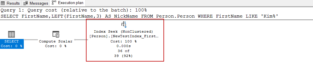 SQL Server indexes help to improve the performance of the queries but due to badly written queries, but in some cases, the query optimizer cannot use indexes efficiently due to incorrectly written queries. Generally, the most common mistake is made to use scalar functions after the where clause. In these cases, SQL Server can not use the indexes efficiently and can not generate an optimum query plan. Now let’s consider the following query. This query fetches records from the Person table with ‘Kim’ as the first 3 leftmost characters of the FirstName column.