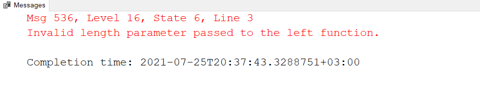 Now, we will try to pass a negative number to the LEFT function. In this case, the function will return an error.