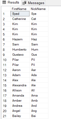 SELECT FirstName,LEFT(FirstName,3) AS NickName FROM Person.Person |
