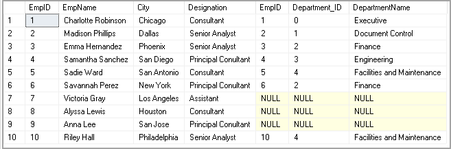 In the following image, you can see we have NULL values for EmpID 7,8 and 9. These EmpID does not exist in the right side Department table.