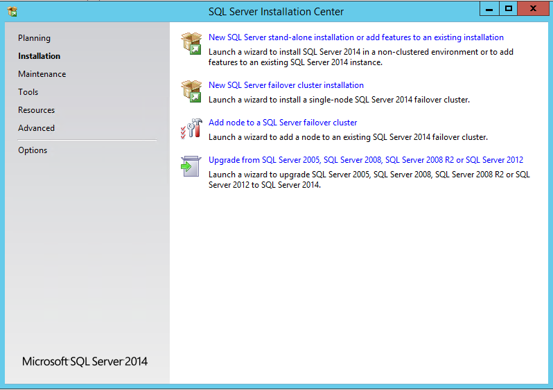 We already opened the “SQL Server Installation Center”, so we now need to go to the “Installation” option, in the menu on the left side, and click on “New SQL Server failover cluster installation” option (the second one).