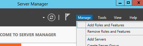 The .Net framework is required, so I need to install this in order to proceed with the installation. So, open the “Server Manager” and go to “Manage”, followed by “Add roles and features”: