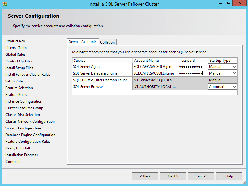 Another prerequisite will be used. Now the service accounts. On this page you need to insert the respective domain accounts and passwords for the SQL Server Engine and SQL Server agent. Make sure to type the correct password, is common to lock out accounts at this step, and not always easy to ask to the domain admin to unlock it 🙂 Another important point, do not change the “Startup Type” to automatic, as a clustered instance, the cluster manages where the instance will be active and all the operations need to be centralized to the Failover Cluster Manager.