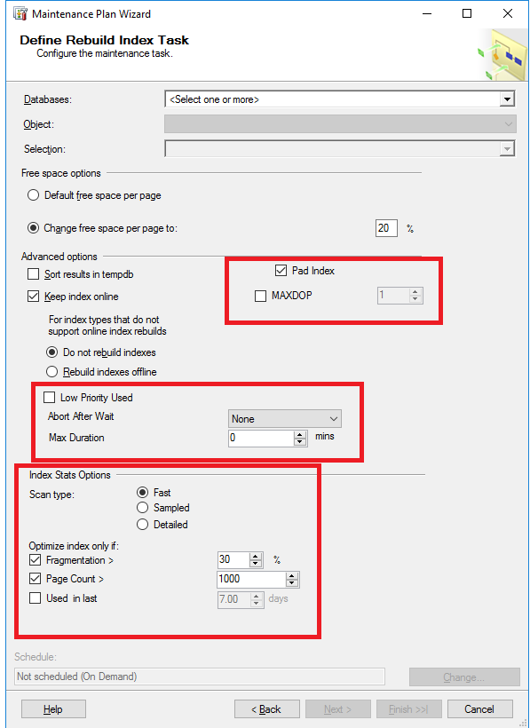 The below window shows the Rebuild Index maintenance task configuration window with the additional enhancements outlined by the red boxes: