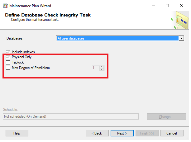 - The Tablock checkbox, that allows the DBCC CHECKDB command to obtain short-term exclusive locks on the database, instead of using an internal database snapshot, speeding up the DBCC CHECKDB command execution, but decreasing the database available concurrency.