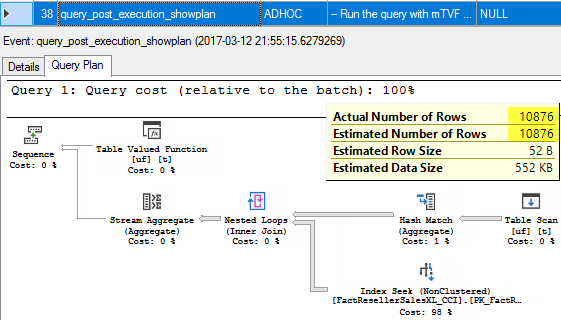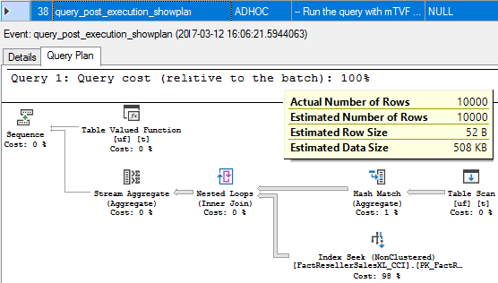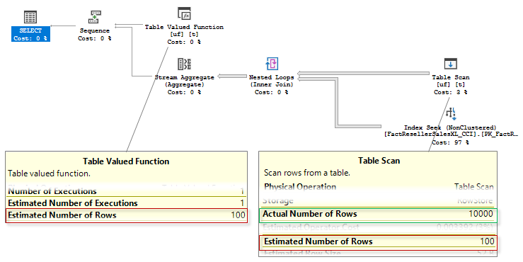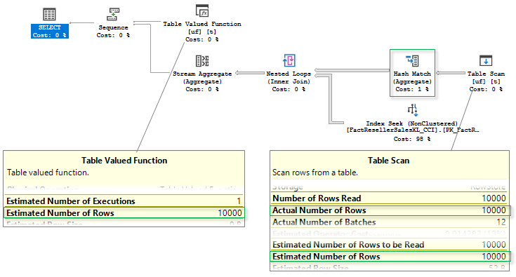 You see that a mTVF cardinality as well as the cardinality of the mTVF result table scan is estimated as 100 rows, as we have said earlier, this is a fixed estimate starting from 2014 (you may try USE HINT (‘FORCE_LEGACY_CARDINALITY_ESTIMATION’) to force the estimate before 2014 and observe 1 row estimate), but actually there were 10 000 rows.