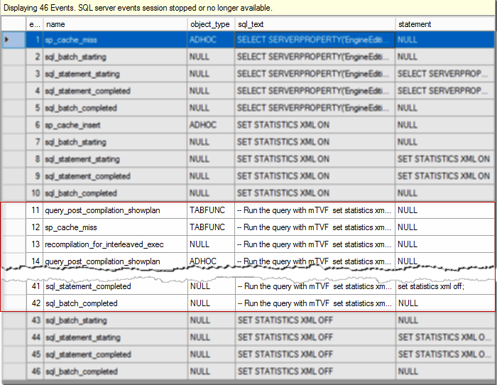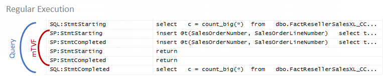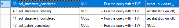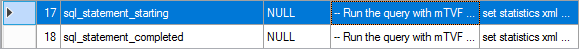 The second statement in the mTVF is a RETURN statement. It is executed so we see the “starting” and “completed” events.