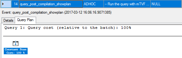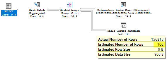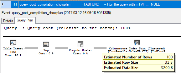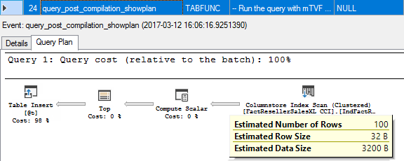 We start compiling our batch with compiling our mTVF. Note the estimated number of rows is 100.