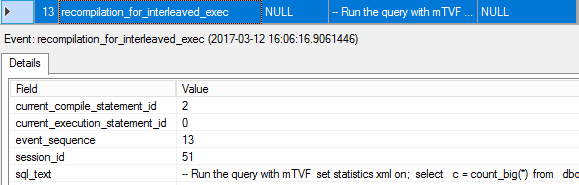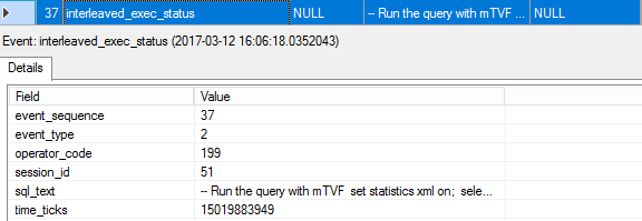 We don’t have a Sequence operator any more, the part of the query can’t be executed independently and there is no interleaved execution and no interleaved execution extended events. In the current version of SQL Server 2017, this query pattern is not supported.