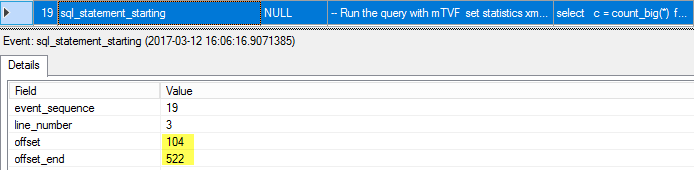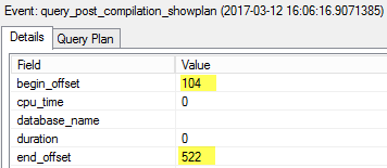 Now we start executing the second statement in the batch – our query. Note the offsets of the statement, 104 and 522, we have seen them already, when a plan stub for the statement was created.