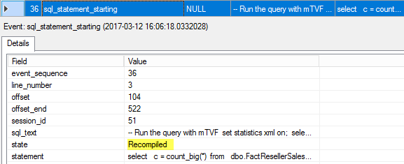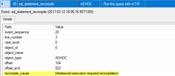 We still have no plan for the statement (because it was marked for the interleaved execution at step 13), but only a plan stub, we need to recompile a statement. Note the reason for the recompilation – it is an “Interleaved execution required recompilation”.