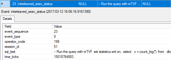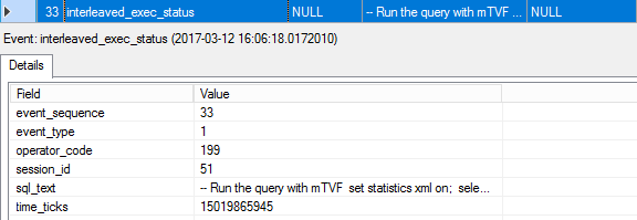 One more event about the interleaved execution status is fired; the event_type equals 1, which stands for “ready to execute the main query”.