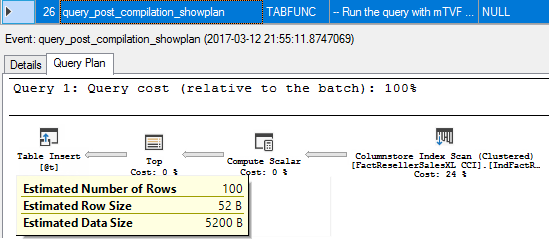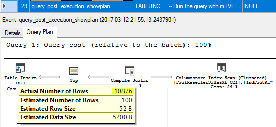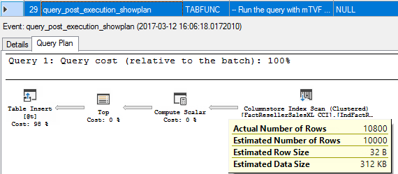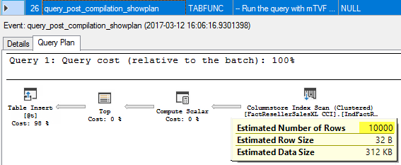 The first statement of mTVF is executed and we see an actual, post execution plan with an actual number of rows. The actual number of rows for Columnstore Index Scan is slightly more than 10 000, which is because it is executed in a Batch Mode, there are 12 batches (you may see it in the plan), each batch may be up to 900 rows, and so 900*12 gives us 10800. That is not a problem, because the Top operator will take only first 10 000 and insert them in the result table.