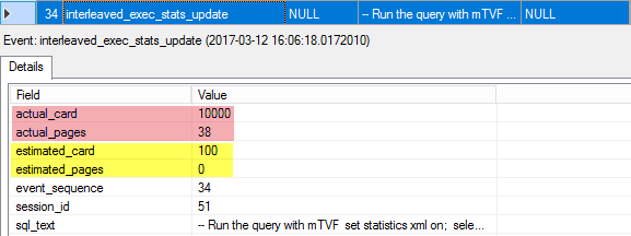 This event describes the statistics that was updated for the interleaved execution. You may see the initial estimated cardinality and the number of pages, as well as the actual number of rows and pages. Those actual values will be used to optimize the rest of the query.