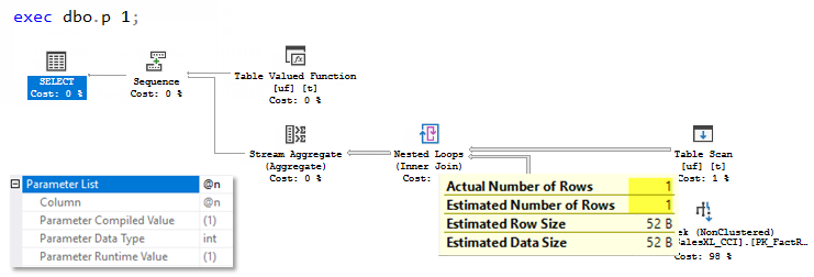 create or alter proc dbo.p (@n int) as select c = count_big(*) from dbo.FactResellerSalesXL_CCI c join dbo.uf(@n) t on t.SalesOrderNumber = c.SalesOrderNumber and t.SalesOrderLineNumber = c.SalesOrderLineNumber option(recompile, use hint ('DISABLE_BATCH_MODE_ADAPTIVE_JOINS')) ; go -- Clear procedure cache for DB alter database scoped configuration clear procedure_cache; go -- Run procedure with different parameters set statistics xml on; exec dbo.p 1; exec dbo.p 1000; exec dbo.p 10000; set statistics xml off; go |