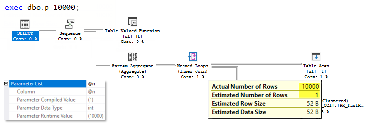 Finally, we have a plan that is compiled with a sniffed value 10 000 due to a recompilation, note the number of estimated rows is now 10 000. This plan is used for the mTVF execution, but the value 10 000 from this plan is not used to optimize the rest of the query, because a post execution plan with an actual cardinality is used for that purpose.
