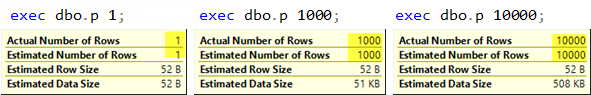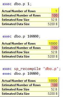 set statistics xml on; exec dbo.p 1; exec dbo.p 10000; exec sp_recompile 'dbo.p'; exec dbo.p 10000; set statistics xml off; go |