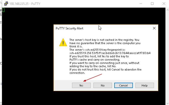 Click on ‘Yes’ to add server host key in the ‘PuTTY’ cache. If we click on ‘Yes’ it does not ask this again if we reconnect to the VM. Else, click on ‘No’ to connect without adding the key to the cache.