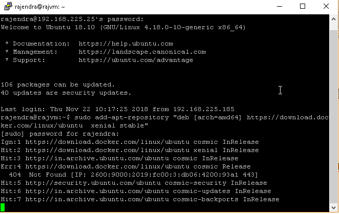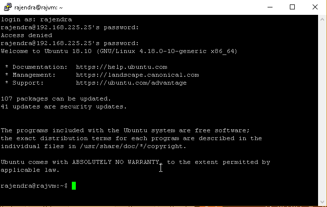 Once connected we can see a message along with OS version ‘ Welcome to Ubuntu 18.10’