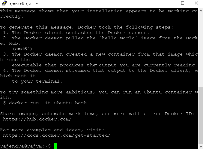 We can test the docker container using the ‘hello-world’ which verifies that the Docker is working fine or not.