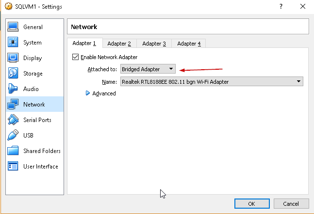 Modify this to ‘Bridged Adapter’ from the drop-down list. In bridged networking, we connect a virtual machine by the network adapter on the host system. Therefore, when you configure to ‘Bridged Adapter’ you can see the host network name as shown here.