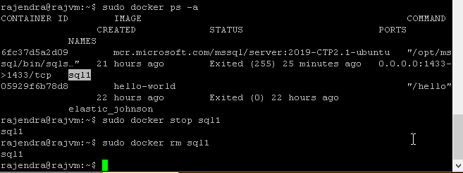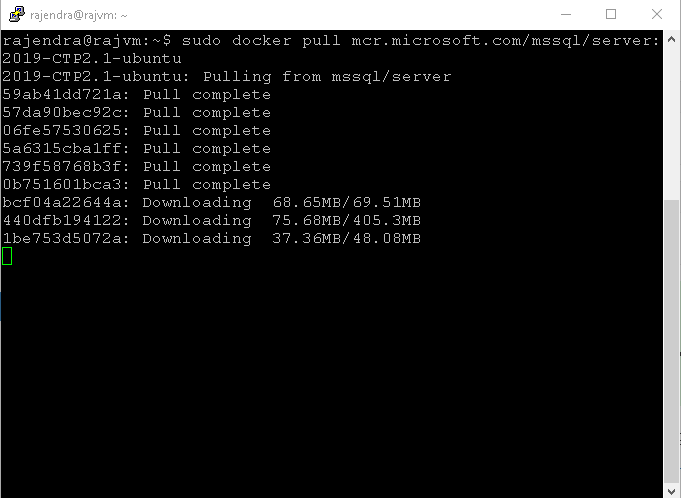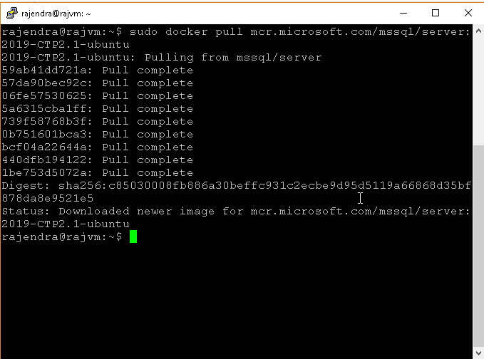You can see here that it downloads the image and extract it. Once it is completed, we can notice the status message ‘Downloaded newer image for mcr.microsoft.com/mssql/server:2019-CP2.1-ubuntu’