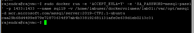 - sudo docker run -e ‘ACCEPT_EULA=Y’ -e ‘SA_PASSWORD=mssql-pass1’ -p 1433:1433 –name sql19 -v /home/labuser/dockervolumes/lab01:/var/opt/mssql -d mcr.microsoft.com/mssql/server:2019-CTP2.1-ubuntu