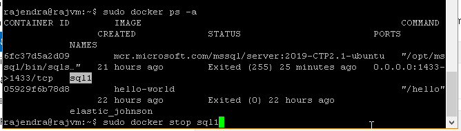 From here, suppose we want to remove the container ‘sql1’, so first, we need to stop running it with below command: