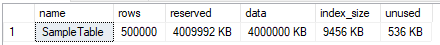 This can be retrieved by sp_spaceused ‘SampleTable’