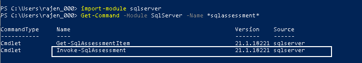 It returns the cmdlet information, its version and the source module. We can see that Invoke-SqlAssessment belongs to the sqlserver module