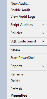 Creating a SQL Server Audit is pretty simple using SSMS. To do so, we must connect to a SQL Server instance (using SSMS) and go down the tree view to “Security/Audits”.